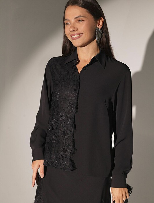 Блузка черного цвета из креп шифона сочетает в себе современные тенденции и классику, позволяя выглядеть элегантно как на торжественном событии, так и на деловой встрече. Материал обеспечивает легкость и комфорт, а изысканное кружево добавляет нотки женственности и утонченности. Нарядная отделка подчеркивает индивидуальность обладательницы, делая образ запоминающимся. Эта рубашка - универсальное решение для разных случаев: она идеально подходит для особых вечеров, торжеств или создания повседневного лука с акцентом на элегантность. Благодаря удачному крою изделие садится по фигуре, не сковывает движения и дарит ощущение свободы в течение всего дня. Деликатное кружево гармонично сочетается с фактурой ткани, формируя стильный внешний вид без лишней вычурности, такой вариант подойдет для создания романтического стиля или дополнения делового гардероба.