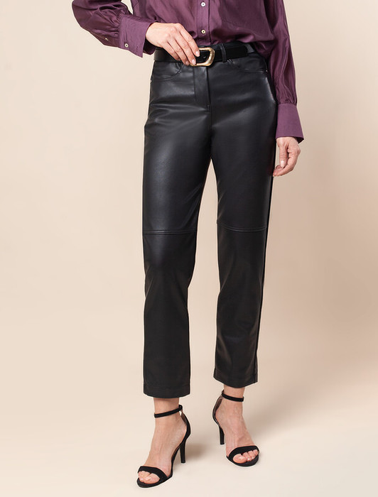 Черные прямые брюки с поясом со шлевками для ремня выполнили из формоустойчивой эко-кожи. Этот эластичный материал не уступает в прочности натуральной коже и легко тянется, не мешая движениям. Бархатистая внутренняя сторона брюк очень приятна к телу, держит тепло и создана для ощущения полного комфорта. Настоящий маст-хэв в прохладное время года, ведь таким брюкам не страшна любая погода. Модель легко сочетается с любым верхом и обувью.