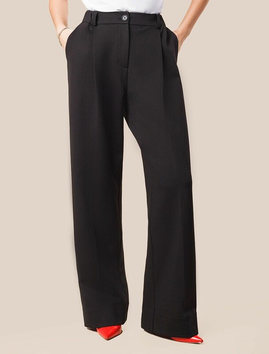 Брюки-палаццо выполнены из костюмной ткани. Свободная модель дополнена карманами и поясом на резинке сзади. Посадка на талии и заутюженные стрелки визуально удлиняют ноги и вытягивают силуэт. Идеальный вариант для офисного дресс кода или в повседневный классический стиль.