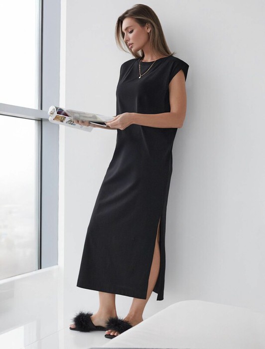 Стильное базовое платье черного цвета длины макси идеально для весны и лета. Легкое и дышащее, оно выполнено из натурального 100% хлопка, что обеспечивает комфортное ношение в теплое время года. Свободный и прямой крой не сковывает движений и легко скроет возможные недостатки фигуры. Благодаря разрезам платье добавляет легкости и непринужденности образу, делая его подходящим для повседневных и непринужденных мероприятий. Короткий цельнокроеный рукав и позволяет чувствовать себя удобно в теплую погоду, а так же в домашней обстановке.  Простота кроя сочетается с современным дизайном, создавая гармоничный лук без излишеств. Это легкое платье подойдет для тех, кто ценит комфорт и элегантность одновременно.