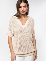 Джемпер-поло связан фактурным узором из тонкой пряжи на основе вискозы с лиоцеллом. Глубокий V- вырез подчеркивает линию шеи. Гладкое и достаточно прочное изделие хорошо держит форму, в нем будет комфортно даже в жаркое время года. Можно носить с бежевым бельем или хлопковым топом. Для самых смелых – на голое тело.