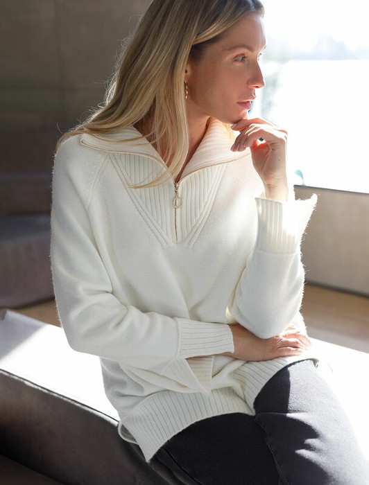 Джемпер с воротом на молнии выполнен из пряжи с кашемиром. Изделие украшает высококачественная фурнитура золотистого цвета и актуальные разрезы на манжетах. Свободный силуэт не сковывает движений и подходит для любой фигуры. Нежная пряжа приятно ощущается на теле, сохраняя тепло при этом не перегревая.