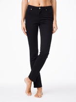 В синем цвете ткань немного толще, чем голубой и черный цвета. Свободные штанины вверху, заужаются к низу, делая силуэт стройнее, открывая нижнюю часть лодыжки.