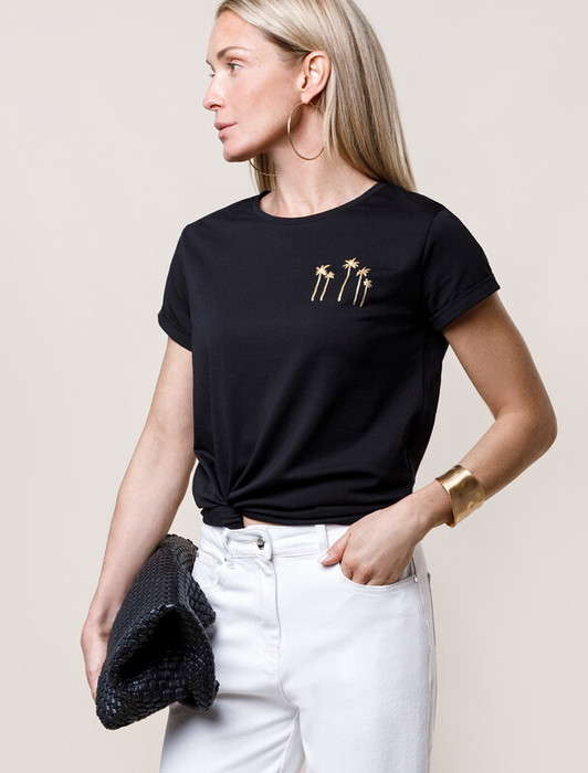 Vilatte Футболка из эластичного хлопка с принтом стразы D49.097 черный_пальмы
