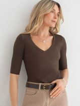Футболка выполнена из трикотажа в широкий рубчик. Модель с квадратным вырезом дополнена декоративными пуговицами.  Эластичный хлопковый трикотаж сидит по фигуре, не сковывает движений и очень комфортный в носке. Фактура вертикальных полос визуально стройнит и вытягивает силуэт. Базовое изделие хорошо впишется в любой гардероб. Идеально подходит для многослойных образов.