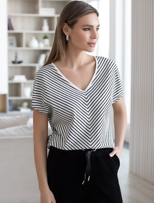 Футболка выполнена из эластичного хлопка. Модель с цельнокроеным рукавом и V-вырезом, который подчеркивают геометрично соединенные полосы. В отличии от классической горизонтальной полоски, такой орнамент стройнит и вытягивает силуэт. Изделие дополнено металлическим логотипом бренда.