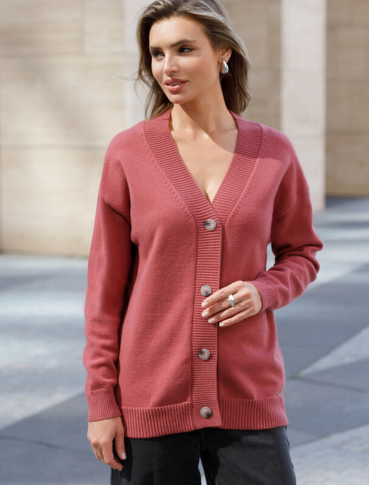 Совместные покупки Омск Женская одежда Поло — Vilatte Кардиган из пряжи с кашемиром D31.147 темно-коралловый