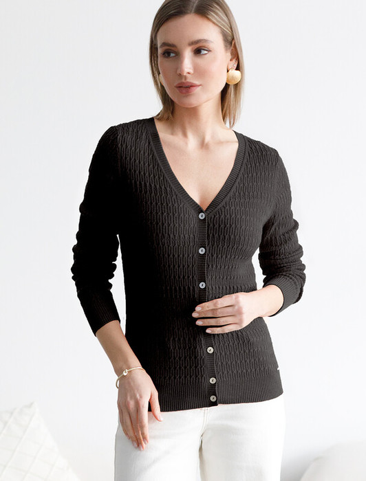 Кардиган тонкой вязки выполнен из хлопка с вискозой. Нежную пряжу, очень приятную к телу, дополняет ажурный узор - плетение косы напоминающий звенья колец. Застежка на пуговицы из натурального перламутра. Модель отлично впишется в весенний и летний гардероб, как самостоятельный верх или накидка на топ или платье. Комфортная длина и крой подходят для любой фигуры.