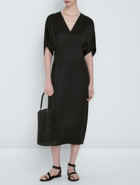 Платье с глубоким V-вырезом и рукавом «летучая мышь» выполнено из тончайших нитей плотного сатина, плетение которых создает полуматовый блеск, напоминающий натуральный шёлк. Модель с длинными глубокими вытачками спереди и сзади выглядит скульптурно, но за счет струящейся ткани сохраняется плавность силуэта. Ткань почти не мнется и имеет легкий вес. Комфортная длина ниже колена и застежка на молнию.