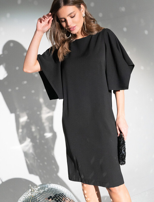 Платье из плотного струящегося крепа прямого кроя с «парящими» рукавами. Фасон платья сбалансирует любой тип фигуры: прямой свободный крой, универсальная длина подола – чуть ниже колена, широкая пройма и акцентные рукава. Классический О-образный вырез фиксируется сзади изящной золотой пуговицей. Материал почти не мнется и комфортен в носке.