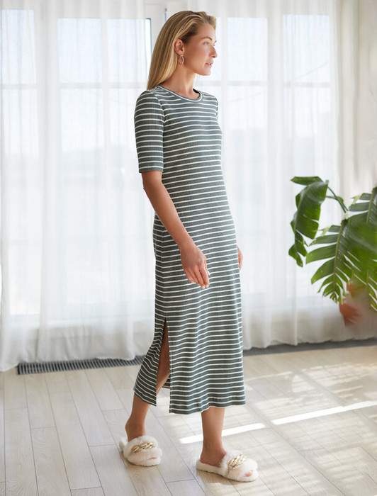 Платье длины миди из мягкого трикотажа выполнено широкий рубчик. Благодаря добавлению эластана материал обладает высокой формоустойчивостью, что обеспечивает комфорт при носке и сохранение первоначального вида после длительного использования. Полуприлегающая посадка подчеркивает фигуру, а длина рукава до локтя делает модель универсальной для любого времени года. Разрезы по бокам добавляют изящности и свободы движений, делая образ женственным и утонченным. Платье станет отличным выбором для создания разнообразных образов — от классического до повседневного стиля. Оно легко комбинируется с аксессуарами и обувью, позволяя вам экспериментировать с модными решениями.