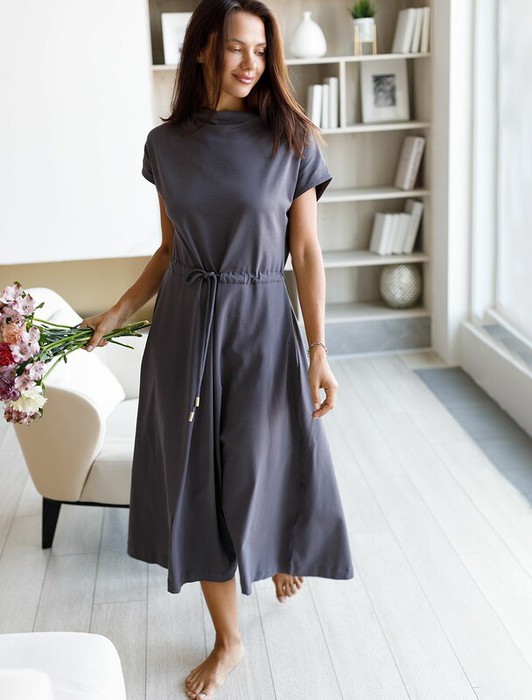 Платье с цельнокроеным рукавом выполнено из премиального хлопка с эластаном. Лаконичная модель свободного кроя, за счет ворота формы лодочка и пояса на талии, создает плавную драпировку ткани, словно в греческом стиле. Подходит для любой фигуры.  Изделие дополнено металлическим логотипом бренда.