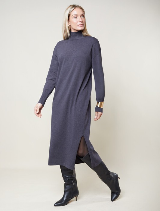 Платье тонкой вязки выполнено из хлопка. Лаконичная модель с высоким воротом дополнена манжетами и разрезами по бокам. Изделие свободно сидит по фигуре и не сковывает движений. Мягкая пряжа очень приятная к телу не колется и сохраняет тепло при этом не перегревая. Изделие дополнено металлическим логотипом бренда.