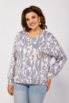 Свитшот выполнен из эластичного футера двухнитки. Изделие дополнили лаконичным принтом стразами в тон изделия. Расслабленный стиль поддерживает спущенная линия плеча, свободный силуэт и разрезы по бокам. Модель сочетается в костюме с брюками D44.135, D44.136, D44.137 и юбкой D46.034