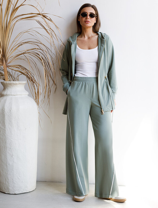 Брюки свободного кроя с контрастными лампасами выполнены из эластичного футера двухнитки. Модель дополнена боковыми карманами. Пояс на резинке фиксируется внутренним хлопковым шнуром. Диагональные визуально стройнят силуэт, а образ становится динамичным. Сочетайте изделие в костюме с паркой D49.076  и свитшотом D49.073