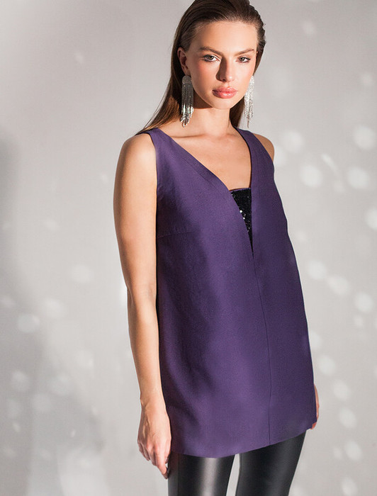 Удлиненный топ свободного кроя с V-образным вырезом и с декоративными разрезами. Выполнен из плотной вискозы с лайоселлом. С изящной треугольной деталью из пайеток в зоне декольте. Универсальный фасон подходит для любого типа фигуры: длина топа позволяет носить его поверх брюк или заправить, сделав акцент на талии. Можно сочетать с жакетом или кардиганом.