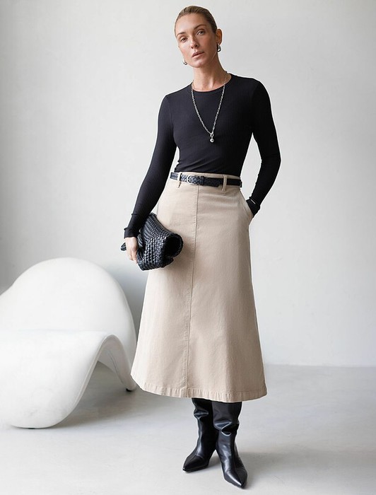 Юбка-миди трапециевидного силуэта  выполнена из мягкого хлопкового микро-вельвета с добавлением эластана. Изделие комфортно садится по фигуре и не сковывает движения. Модель дополнена высококачественной фурнитурой с фирменным логотипом бренда. Хорошо комбинируется с вязаным трикотажем, блузками и денимом.Также прекрасно станет альтернативой деловым низам  в нестрогом офисном дресс-коде.