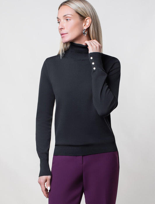 Водолазка тонкой вязки выполнена из хлопка. Лаконичная модель дополнена манжетами с золотистыми пуговицами. Изделие не сковывает движений и подходит для любой фигуры. Мягкая пряжа очень приятная к телу не колется и сохраняет тепло при этом не перегревая.