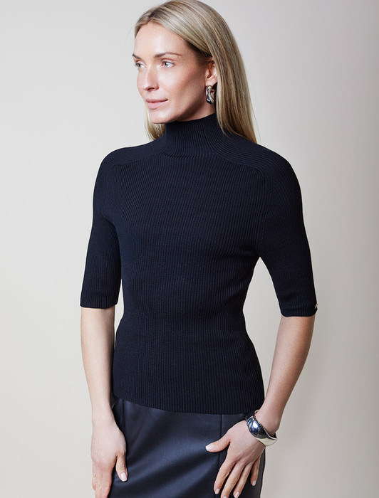 Водолазка тонкой вязки в рубчик выполнена из хлопка. Лаконичная модель с коротким рукавом дополнена металлическим логотипом бренда. Изделие идеально сидит по фигуре и не сковывает движений. Мягкая пряжа очень приятная к телу не колется и сохраняет тепло при этом не перегревая.