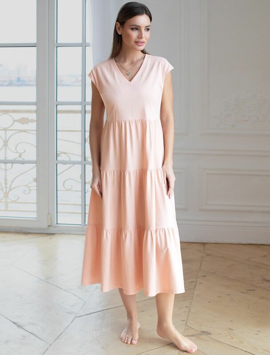 Стильное платье миди с V вырезом привлекает внимание своим нежным пудровым цветом и натуральным материалом — 100% премиальным хлопком. Такой выбор ткани обеспечивает отличное дышащее свойство, что делает платье идеальным для теплого времени года и домашнего использования. Особенностью модели является ярусный крой и А силуэт, которые красиво подчеркивают фигуру, скрывая возможные недостатки и акцентируя достоинства. Свободное платье отлично подойдет на большие размеры. Длина платья миди обеспечивает гармоничное сочетание комфорта и элегантности, подходя для разных поводов. V-образное декольте придает образу нежность и женственность, а ярусная конструкция добавляет образу эффект воздушности и динамичность. Материал натуральный и приятный к телу, создает ощущение легкости и свежести. Такое повседневное платье подчеркнет индивидуальность и стиль.