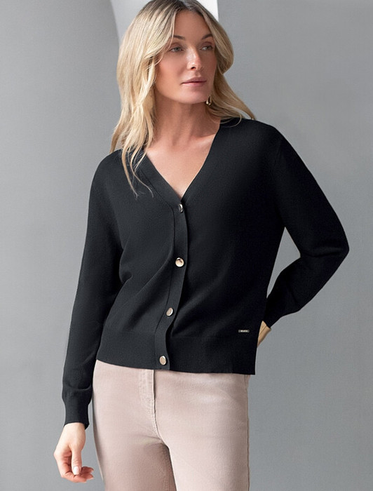 Жакет тонкой вязки выполнен из вискозы с нейлоном. Модель с V- вырезом дополнена золотистыми пуговицами и фирменным металлическим логотипом бренда. Мягкая пряжа приятная к коже позволяет носить изделие как первый слой, а также рекомендуем использовать как кардиган в многослойных образах поверх топа или платья.