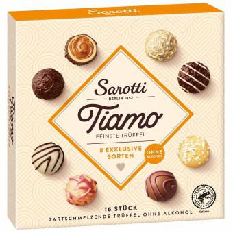 Изысканный выбор с нежнейшими тающими вкусами. Безалкогольные трюфели Sarotti Tiamo Finest Truffles – это восемь эксклюзивных сортов пралине, которые подарят вам истинное наслаждение. Эти восхитительные трюфели удивляют фруктовыми начинками с насыщенным вкусом, а благодаря безалкогольному рецепту подойдут и сладкоежкам.