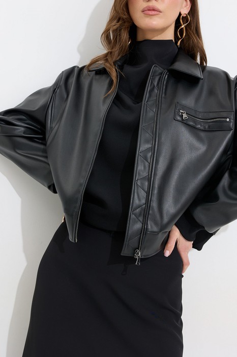 Описание Жакет прямого силуэта из экокожи. Воротник отложной, по центру застежка на молнию. Жакет с удлиненной линией плеча, рукав одношовный втачной, по низу рукава манжета (из трикотажного полотна). По переду рельефы с функциональными карманами и декоративный элемент с молнией. На спинке кокетка. По низу жакета притачной пояс (из трикотажного полотна). Жакет на подкладке. Обращаем ваше внимание, что фурнитура может отличаться от фото.
