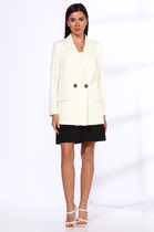 Укороченный жакет свободного силуэта, двухбортный со спущенным плечом. Перед и спинка на кокетках. По переду в кокетках декоративные клапаны. Рукав длинный на притачной манжете.