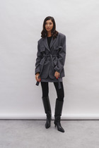 Прямой силуэт,втачной двухшовный    рукав со шлицей.Отложной воротник с лацканами.В среднем шве спинки шлица.