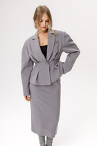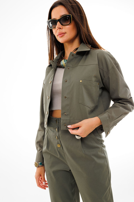 Джут короткий, до талии. Рукав длинный с манжетам. Застежка по переду на кнопки. Горловина обработана воротником. Спинка декорирована планкой на кнопках.
