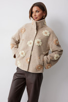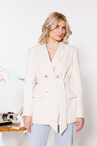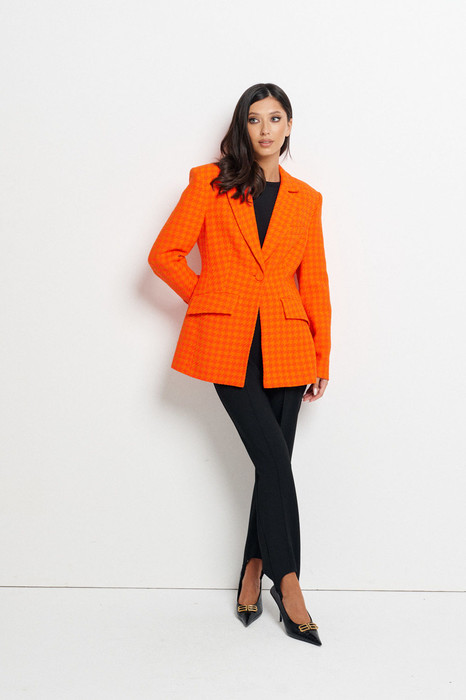 Жакет прилегающего силуэта выполнен из фактурной ткани. Характеристики: прилегающий силуэт, однобортный, подплечники, подкладка, отложной воротник с лацканом, застежка центральная на петлю пуговичку, рукав втачной, по низу рукава пуговички, пуговички в изделии декорированы тканью основного изделия, по переду прорезные карманы с клапаном. Длина по спинке 69 см, длина рукава 64 см.