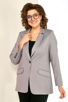 Укороченный жакет прямого кроя с акцентным воротником выполнен из костюмной ткани. Характеристики: укороченный, подплечники, крупный отложной воротник контрастного черного цвета, застежка центральная петли - пуговички, прорезной кармашек по передней части изделия, рукав втачной. Длина по спинке 43 см, длина рукава 62 см.