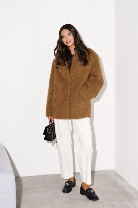 Жакет прямого свободного кроя выполнен из фактурной мягкой ткани, коричневого цвета. Характеристики: прямой свободный крой, подкладка, подплечники, воротник с остроугольным лацканом, застежка центральная на петли - две пуговицы, по переду функциональные карманы с клапаном, рукав втачной, спинка цельнокройная. Длина по спинке 80, длина рукава 61 см.