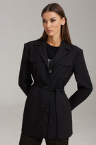 Жилет выполнен из текстильного полотна черного цвета. Полуприталеный силуэт,подклад, овальная горловина, талиевые выточки по передней и задней части изделия, грудные выточки Воротник отложной с лацканом. Застёжка центральная на петли-пуговицы. Карманы по переду внизу накладные с клапаном (функциональные). Длина спинки жилета 44 см.