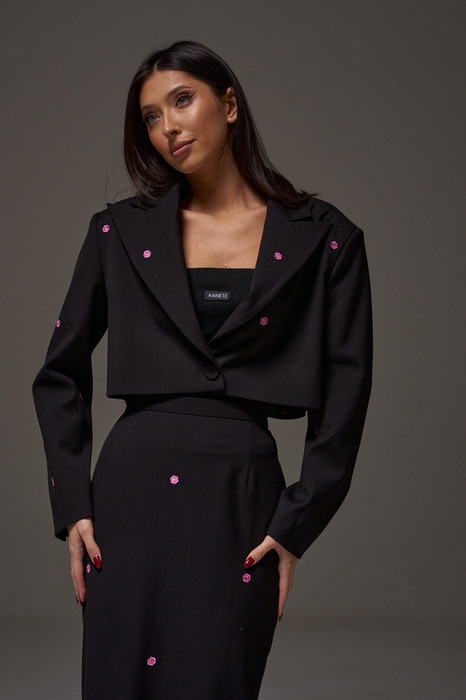 Жакет выполнен из костюмной ткани черного цвета с цветочной вышивкой. Характеристика: укороченный жакет, отложной воротник с острым лацканам, центральная застежка на петлю-пуговицу, брендированный подклад, рукав втачной, чуть спущенный, подплечники, на манжете три пуговицы. Длина рукава от края горловины 79см, длина жакета по спинке 43см.