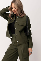 Жакет 2-бортный, на подкладке. Рукав длиннный, втачной, одношовный, по окату собран складками дляя увеления объёма. Обработаны талиевые вытачки по переду и спинке изделия