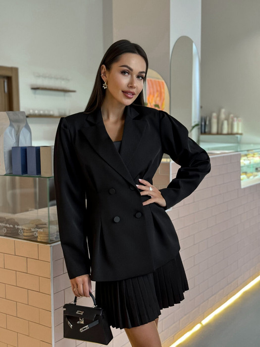 Жакет 2-бортный, на подкладке. Рукав длиннный, втачной, одношовный, по окату собран складками дляя увеления объёма. Обработаны талиевые вытачки по переду и спинке изделия