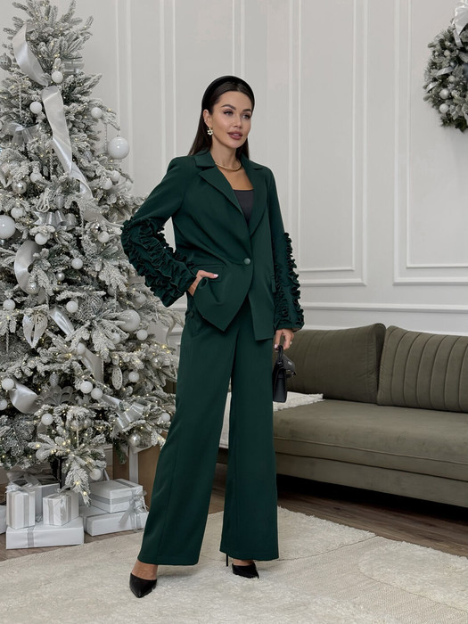 Жакет однобортный свободного силуэта, обработан подкладкой. Рукав втачной, расклешенный, одношовный. По рукаву настрочены рюши из основной ткани. Объём присборенных рюш распределен равномерно. Данный жакет дополнит любой образ, выделит среди всего разнообразия