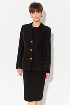 Жакет однобортный классического силуэта, на подкладке. Борта по низу имеют закругленную форму.Рукав втачной, прямой.Обработаны 2 кармана с клапанами и один карман с листочкой