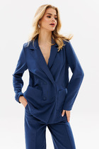 Жакет однобортный, на подкладке, выполнен из эко-замши. Обработан молнией разъёмной молнией по центру переда, закрывающейся планкой с пуговицами. Воротник тложнй, рубашечного типа. Рукава втачные одношвные, прямые. По передним половинкам обрабтаны накладные карманы с клапаном.