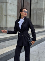 Жакет однобортный свободнго силуэта. Жакет обработан подкладкой. Рукав прямой, длинный, втачной, отрезной с пришитой присборенной деталью, шнурком из основной ткани для завязывания.