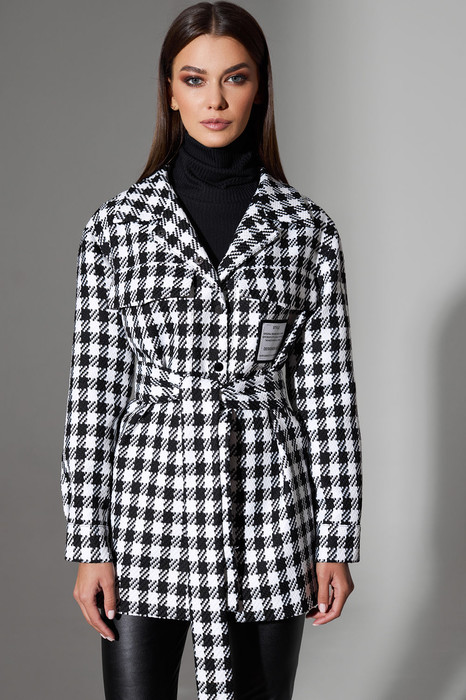 Жакет женский из костюмной ткани на подкладке, свободного кроя. Рукав спущенный с притачной манжетой, застегивающийся на пробивную кнопку. На полочках обработаны накладные карманы с клапаном, на кармане с одной стороны декоративная нашивка. Воротник стойка, застежка центральная застегивающаяся на пробивные кнопки. В боковых швах карманы.
