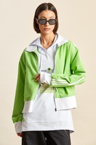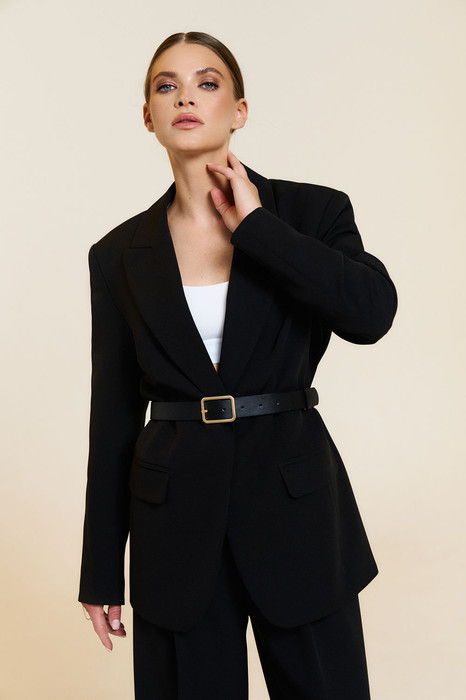 Жакет женский из ткани платьево-костюмного ассортимента черного цвета на подкладке. Перед с разрезной выточкой, входящей в прорезной карман в рамку с клапаном. Спинка прямая. Бочок переда и спинки цельнокроенный. Рукав двухшовный втачной. Воротник пиджачного типа вставлен на раскепы. Борта обработаны подбортами округлой формы. Застежка на пришивные кнопки, талию фиксирует съемный пояс.