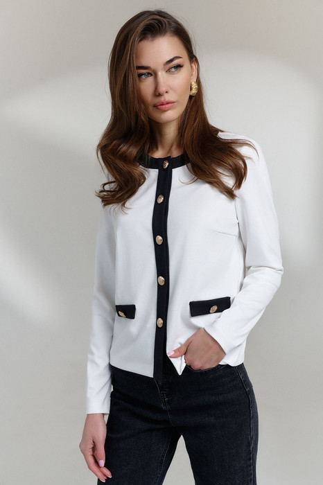 Джемпер женский выполнен из трикотажной ткани. Имеет прямой силуэт жакетного типа. Горловина округлой формы. Планки переда и горловины, а также клапаны, имитирующие карманы, выполнены из контрастного цвета. Рукав втачной одношовный. По переду имеются нагрудные вытачки. Застежка на пробивные петли и пришивные декоративные пуговицы.