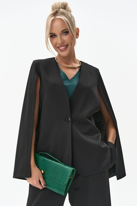 Лаконичный жакет – кейп, который станет основой современного гардероба. Чёткий крой подчёркивает линию плеч, создавая элегантный силуэт, а универсальная длина позволяет носить модель как с брюками, так и с юбками. Он прекрасно смотрится на любых фигурах, в том числе на больших размерах, подчёркивая достоинства и скрывая возможные недостатки. Выполнен из приятной на ощупь ткани, хорошо держит форму и не теряет актуальности со временем.