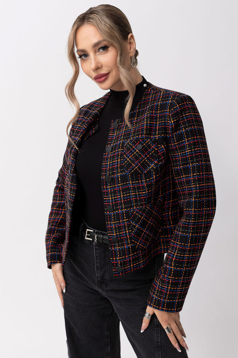 Жакет с центральной застежкой на петли и пуговицы, без воротника, с круглым вырезом горловины. По переду с накладными карманами на уровне груди и талии, закрепленными к полочкам петлей и пуговицей, рельефами, выходящими из проймы,. По спинке со средним швом. Рукав втачной, длинный.
