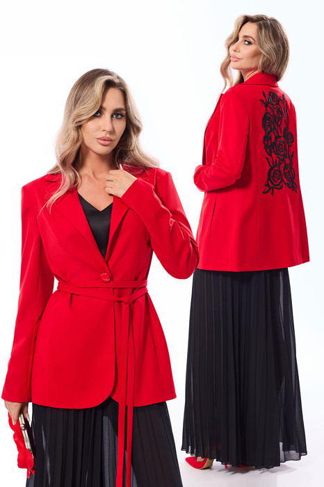 Жакет с центральной застежкой на петли и пуговицы, втачным воротником и лацканом пиджачного типа. По переду с рельефами, выходящими из проймы и нагрудными вытачками. В рельефных швах расположены карманы. По спинке с рельефами, выходящими из проймы. Центральная часть спинки с вышивкой в тон основной ткани. Рукав втачной, длинный.