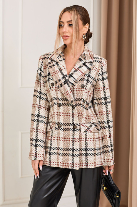 Жакет с центральной двубортной застежкой на петли и пуговицы, втачным воротником и отложными лацканами пиджачного типа. На полочках расположены прорезные карманы с клапаном и двумя обтачками. Полочки с рельефами, выходящими из проймы, талиевой вытачкой. Спинка со средним швом, рельефами, выходящими из проймы. Рукав втачной, длинный, двухшовный.
