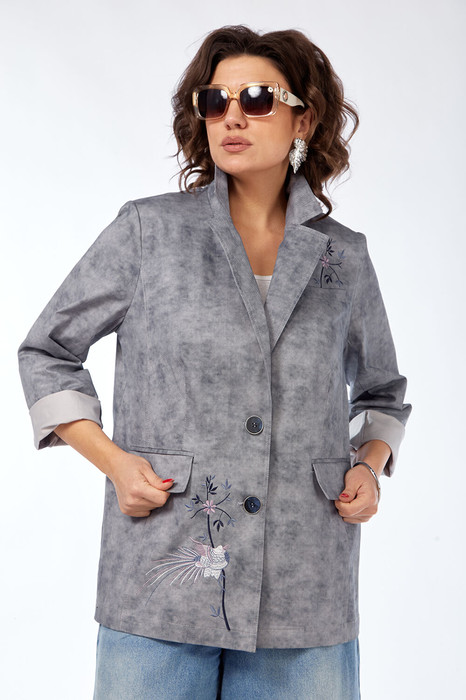 Блейзер женский, прямого силуэта, выполнен из хлопковой  ткани костюмного ассортимента. Воротник пиджачного типа, застежка центрально-бортовая на две петли и пуговицы. По переду обработана нагрудная листочка и прорезные карманы с клапаном и двумя обтачками, фигурные рельефы выходящие из проймы. Спинка со средним швом, в котором имеется высокая шлица. Рукава втачные двухшовные, с широкой подборкой низа. Изделие декорировано дизайнерской вышивкой.
