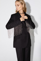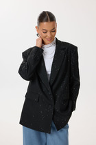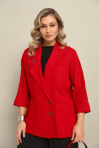 Жакет большого объёма с двубортной застежкой по одной стороне на петли и пуговицы. Рукава 3/4 с манжетами. Жакет без подкладки. По переду расположены накладные карманы. Длина жакета по спинке 70-72 см.